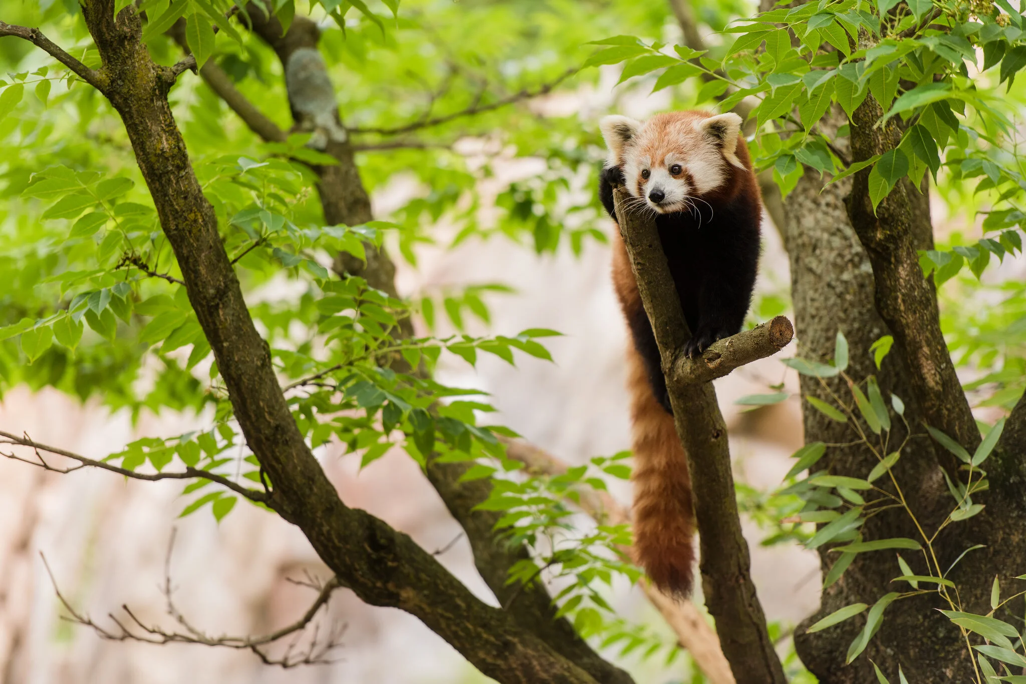 Red Pandas live up in the tree tops, making them skilled tree climbers. Technically an omnivore, the Red Panda really stays as a herbivore eating plants and bamboo. Their bushy red tail allows for balance as well as warmth throughout the winter months. The Red Panda frequently likes to have fun and play with themselves or each other as well.